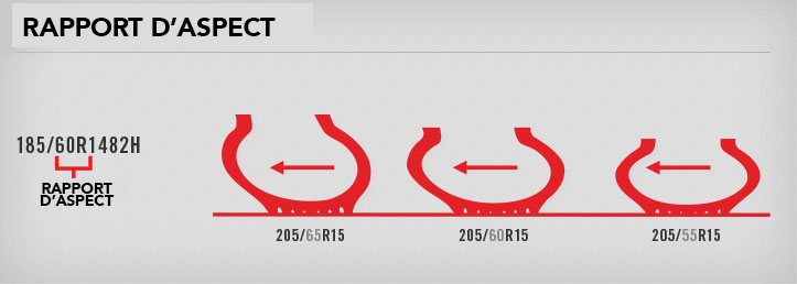 Un pneu doté d'un rapport d'aspect bas répond plus efficacement aux forces latérales qu'un pneu dot‚ d'un rapport d'aspect élevé. Le rapport d'aspect influe sur la stabilité de la direction. En règle générale, plus le flanc est étroit, ou le rapport d'aspect plus bas, plus le temps pour transmettre la commande du volant aux roues est court. Donc une réaction … la direction plus rapide. Le rapport d'aspect influe aussi sur l'empreinte au sol. En règle générale, un pneu au profile surbaissé laisse une plus large empreinte plus rigide au sol, ce qui réduit la distorsion et assure une meilleure adhérence dans les courbes. Le rapport d'aspect influe enfin sur la conduite. Un pneu au profil surbaissé assure une conduite plus rigide qu'un rapport d'aspect standard de 75 ou plus.